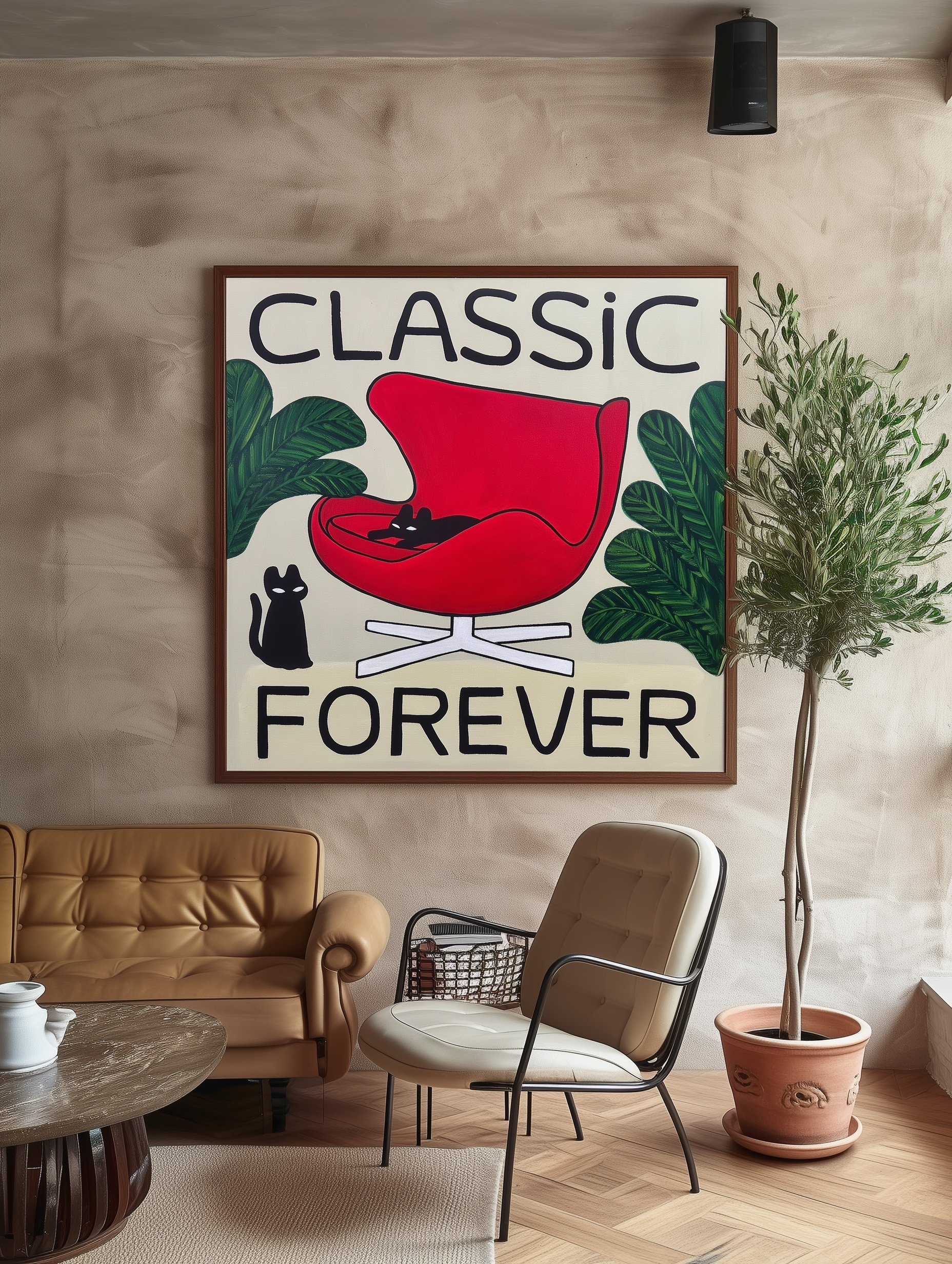 CLASSIC FOREVER” captures the timeless allure of design through a vivid red chair and a serene black cat. Influenced by Bauhaus ideals during his design studies in Italy, the artist celebrates simplicity, aesthetics, and function in perfect harmony. The red, white, and green palette echoes the Italian flag—a quiet homage to his design journey and to the enduring grace of the classic.
