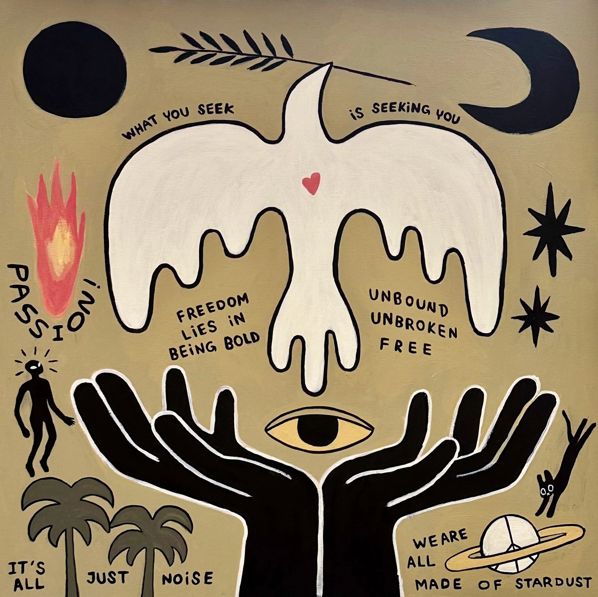 《自由之心》靈感源於一次冥想時刻,映照出靈魂對解放與覺醒的渴望。手象徵保護與釋放,白鴿與橄欖枝代表和平與希望;中央的眼睛象徵宇宙的覺知與內在洞察,火焰象徵燃燒的熱情與重生;畫面中外星人的元素寓意超越人類疆界的探索與未知的勇氣,而棕櫚樹則代表平靜、生命與心靈的歸宿——一場從束縛、燃燒到重生與自由的象徵之旅。